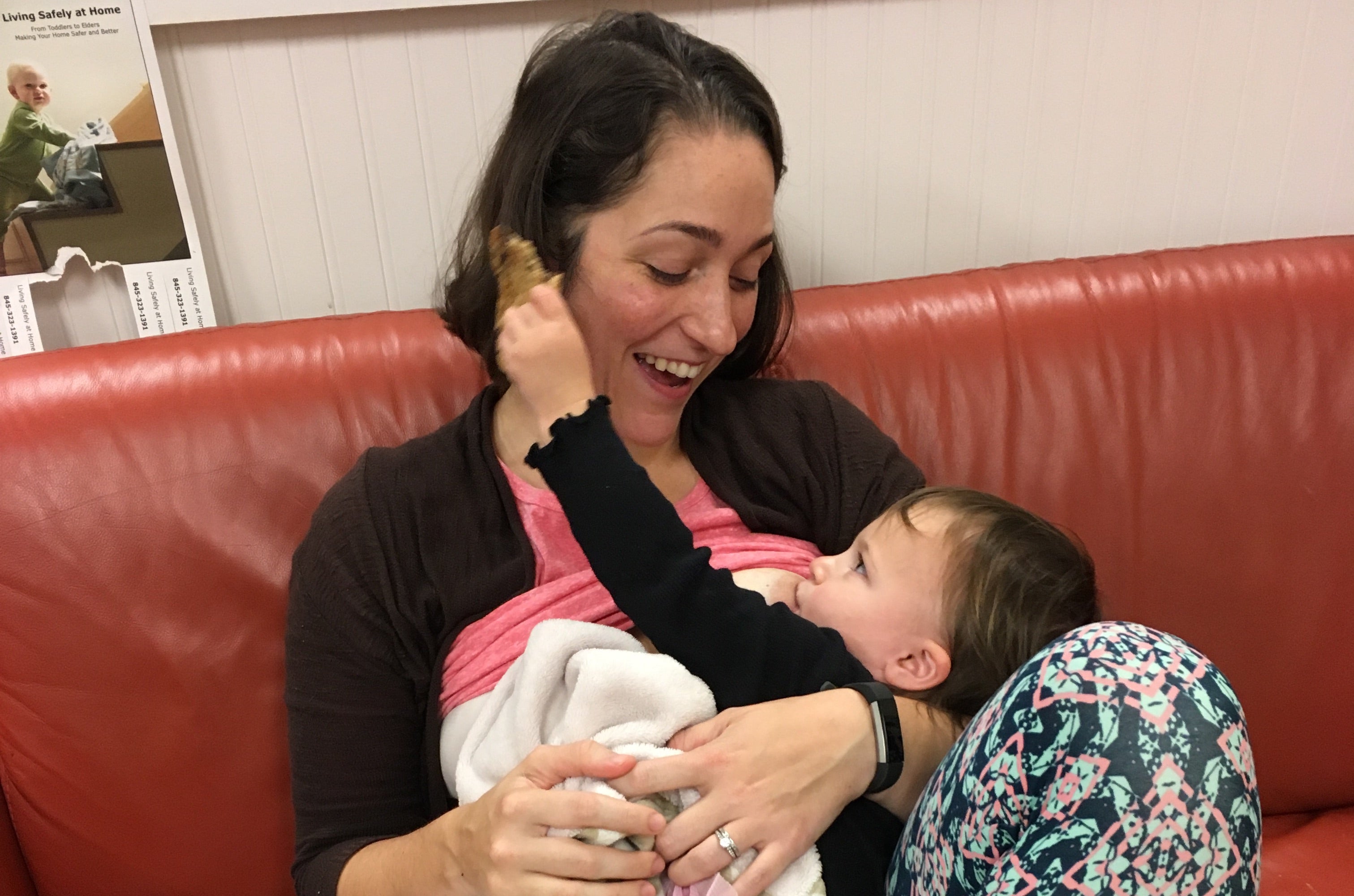 De volgende dag ging ze in de sneeuw op huisbezoek. Donna werkte geduldig met mij mee om mij te helpen mijn zelfvertrouwen terug te krijgen, hielp mij bij het omgaan met extreme stuwing en hielp mij inzien dat het goed met mij ging. De baby at en groeide vrolijk en maakte heel veel luiers vuil.